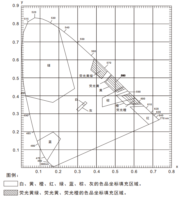 在《GB?2893安全色》、《GB/T?18833道路交通反光膜》等相關(guān)標(biāo)準(zhǔn)中,通常給出一塊顏色區(qū)域(多個(gè)色品坐標(biāo)點(diǎn))和亮度因數(shù)要求,在D65/A光源和45/0幾何條件下,判定樣品是否落在對應(yīng)的顏色區(qū)域內(nèi),借此判定樣品是否滿足標(biāo)準(zhǔn)規(guī)定的色度要求。由于顏色區(qū)域?yàn)槎噙呅?,如下圖所示,導(dǎo)致使用普通的分光測色儀無法完成判定。NS808測色儀配合SQCT軟件的交通路標(biāo)測量模塊則可以輕松解決這方面的問題。