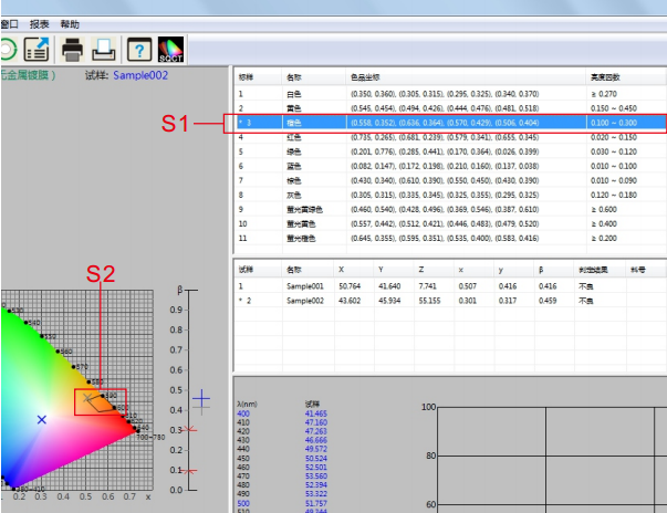 雙擊標(biāo)樣區(qū)域的藍(lán)色,如圖12中是S3所示部分,使藍(lán)色為當(dāng)前標(biāo)樣,藍(lán)色多邊形-容差標(biāo)樣(《GB/T?18833-2012道路交通反光膜樣》規(guī)定的藍(lán)色區(qū)域)則顯示在S4部分。